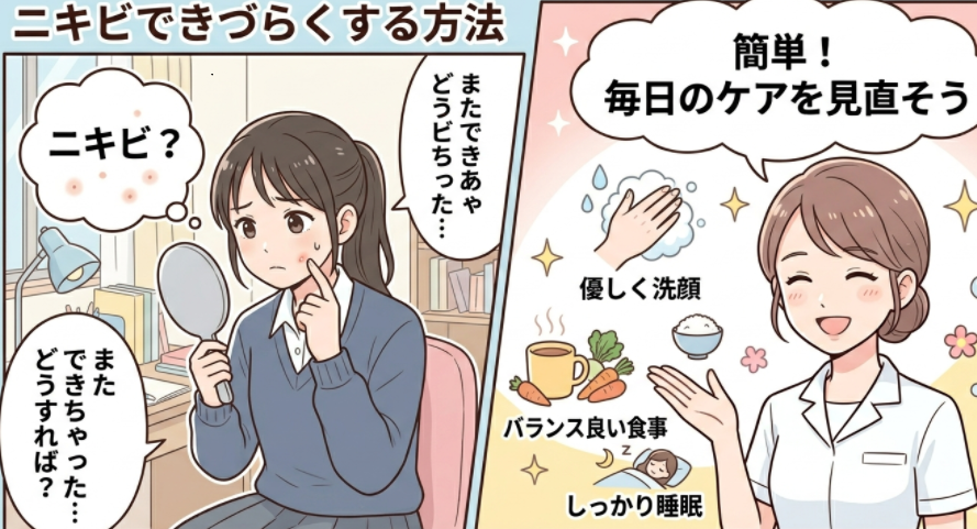正しい洗顔と保湿でバリア機能を整え、十分な睡眠と栄養バランスのよい食事でターンオーバーを正常に保ち、ストレスを溜めない習慣を身につけることが、ニキビが繰り返しできる状態から抜け出す現実的な道筋です。