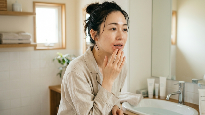 食事を改善しても口周りのニキビが数週間以上続く場合は、食事以外の要因も見直す必要があります。口周りは皮膚が薄く乾燥しやすい部位のため、洗顔後の保湿が不十分だと乾燥による皮脂の過剰分泌が起きやすくなります。