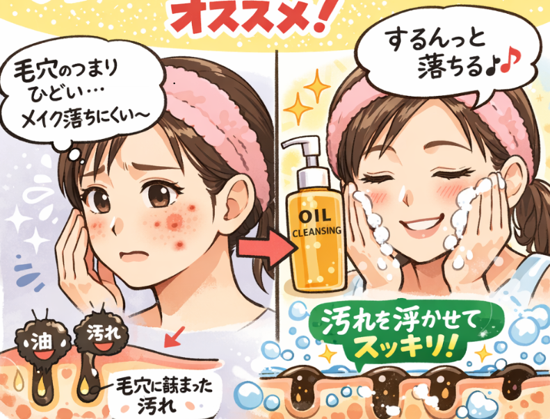 また、クレンジングオイルをすすぐ前に十分に乳化させないと、メイク汚れとオイルが完全に水と混ざり合わず、皮膚に残留します。この残留オイルが毛穴詰まりの原因になることがあります。